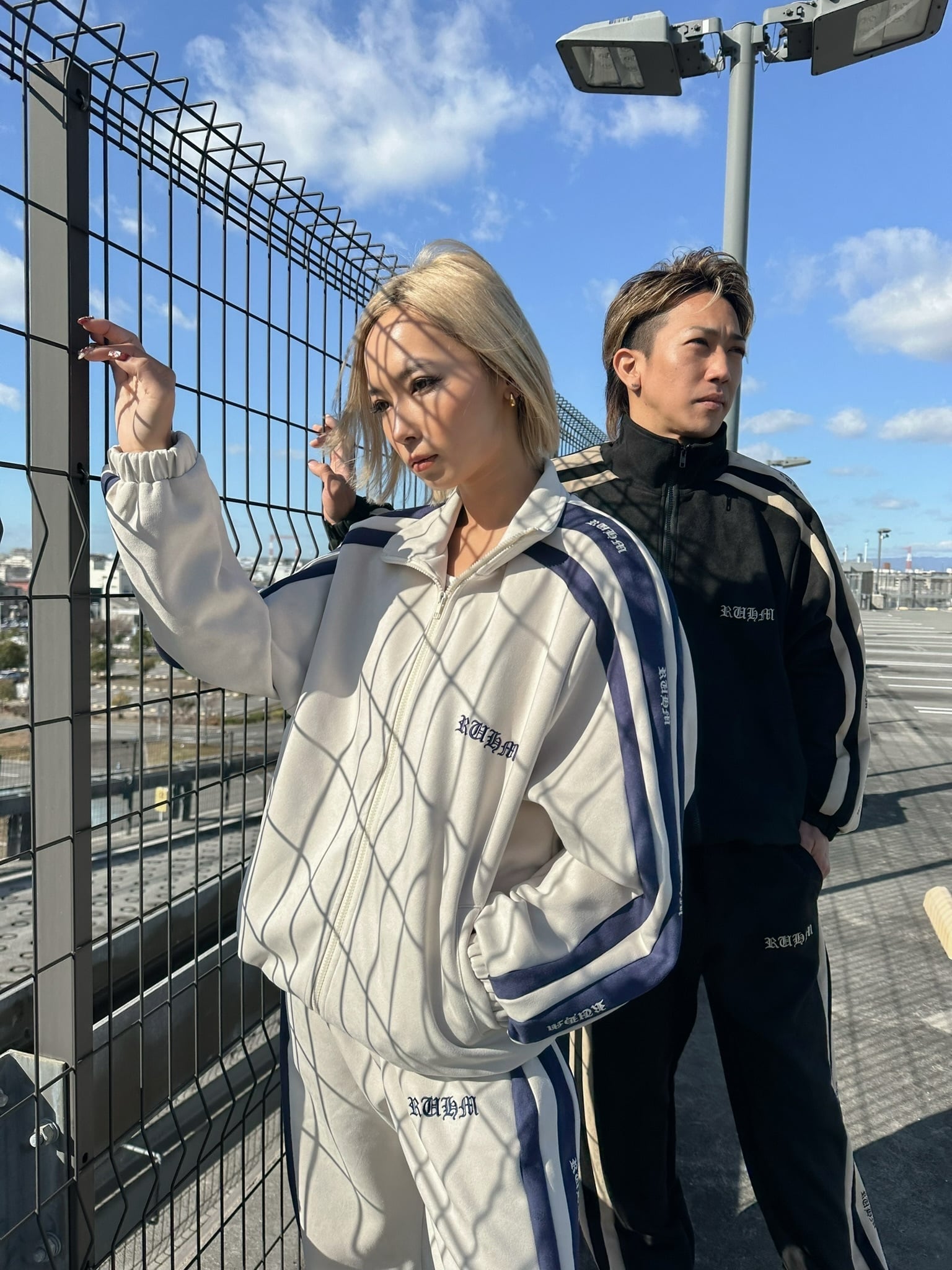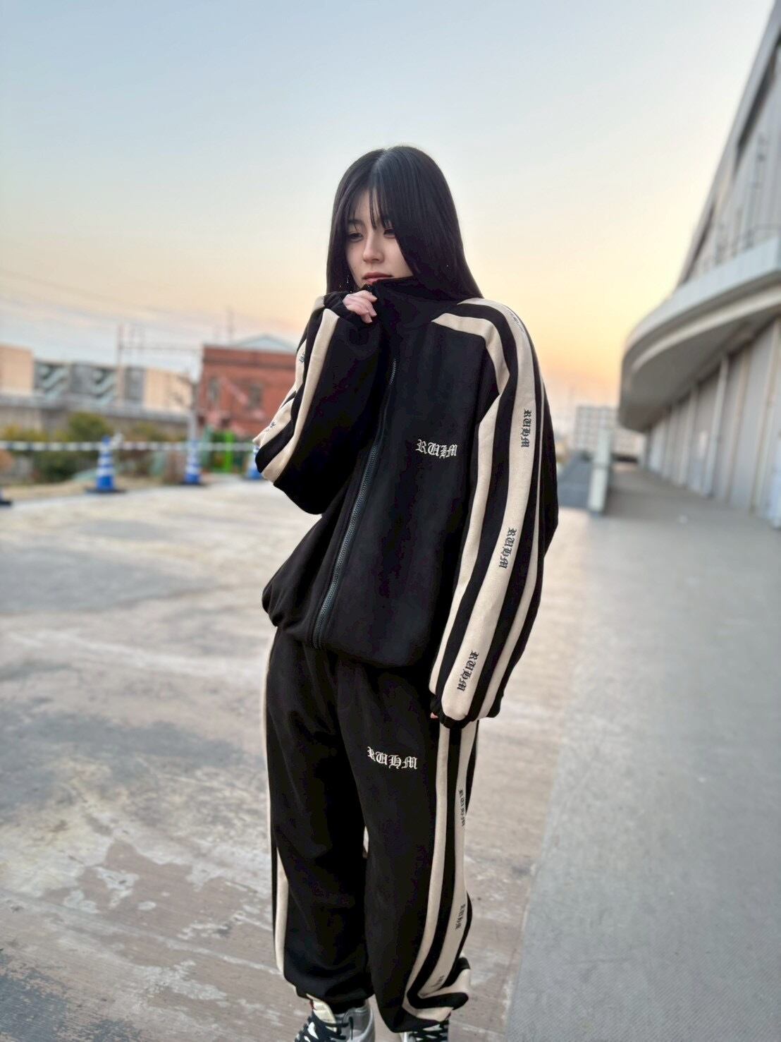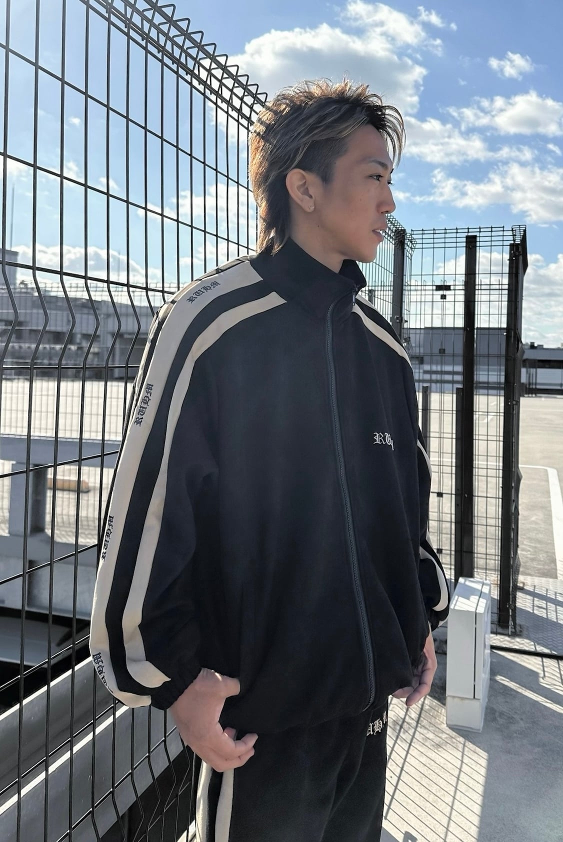 袖へ走る RUHMロゴライン を組み合わせた新作トラックジャケット。